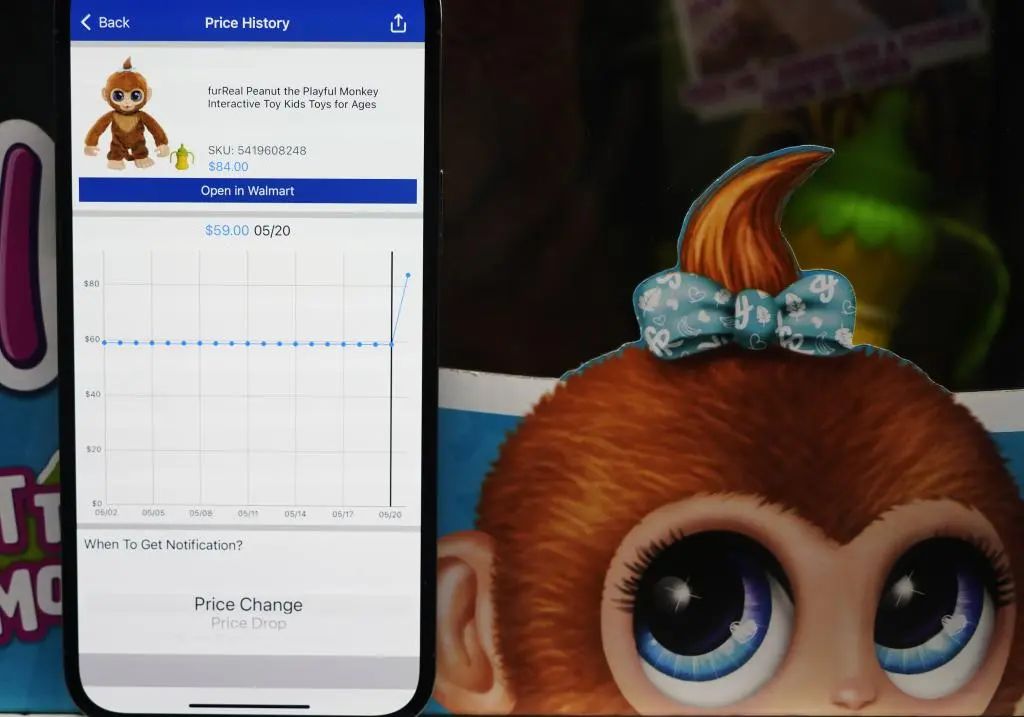 ▲5月21日,在美国旧金山湾区的一家沃尔玛超市,价格跟踪软件(Walmart Tracker)显示中国产毛猴玩具售价变化。